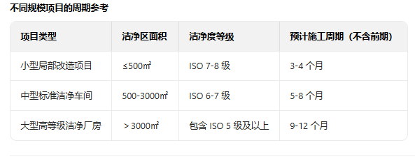 - 洁净区规模与布局:面积越小、布局越简单,周期越短。例如,1000㎡以下的 ISO 7 级车间,可能 3-5 个月完成;而 10000㎡以上、包含多个 ISO 5 级洁净室的复杂项目,周期可能长达 8-12 个月。